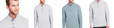 5.3 oz/yd2 / 174 gsm, 69% polyester, 26% lyocell 5% spandex jersey; The fiber lyocell from Lenzing® is a sustainably sourced, renewable and bio-degradable botanic fiber; Moisture-wicking and antimicrobial performance; Henley placket with metal two-snap closure; Self-fabric cuffs with integrated thumbholes; Hi-low hemline; Side vents; Stretch performance; Active fit; Easy care;