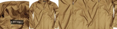 82 GSM, 100%polyester; Exterior water-resistant coating; Matte finish eyelets and zippers; Rubber zipper pull tab, reversed zipper tape; Fine mesh hood liner; Scuba neck, elastic binding on cuff; Welt pockets with mesh pocket bags; Storm flap cover on top of zipper to protect the neck; Toggle at waistband, locker loop in center neck;