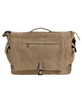 12 oz., 100% cotton concrete canvas; Large interior pocket equipped with functional pocketing; Padded laptop sleeve; Zippered outer pocket and two secure side pockets; Snap closure; 15.6L capacity; 16"W x 12"H x 5.25"D;