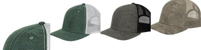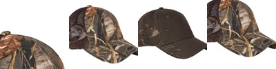 100% cotton, brushed chino twill; Camo - 60% cotton/40% polyester; Waxy - polyester/cotton/polyurethane blend; Blaze - 100% Polyester; Structured front; Pre-curved visor; Hook and loop backstrap; Detailed embroidered wildlife scene on right side; DRI DUCK embossed leather patch left of back vent; RealTree Max 4 is a mesh back cap;