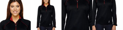 100% polyester birdseye mesh, 4.7 oz./yd2/160gsm; Moisture wicking, antimicrobial and UV protection performance; translucent zipper with contrast treading ; inside placket with chin guard; subtle contrast coverstitch details at raglan and back sleeves ; underarm gusset; decorative reflective print on left front and back;