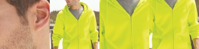 - Two-ply hood with rib trim, contrast color liner and drawcord