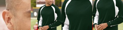 Contrasting yoke and top sleeve inserts add pizzazz to a moisture-management pullover.