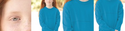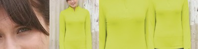 - Contrast color raglan sleeves, collar, "V", and waistband