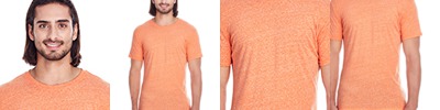 5.3 oz., 100% cotton; Burn out with contrasting thread; No two are alike; Slim fit;