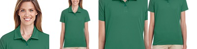 4 oz., 100% polyester mesh; Moisture-wicking; Pill-resistant; UPF 40+ protection; Feminine silhouette; Contrast tipping on knit collar; 3-button placket; Contrast side panels;