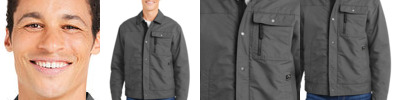 - Dual closure, four-snap placket and heavy-duty zipper with easy grab pull