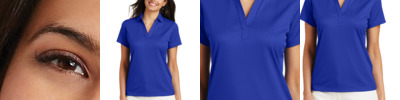 Lightweight and breathable, this moisture-wicking shirt has a pleasing drape, subtle jacquard texture and an open placket for feminine style.