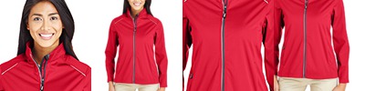 Heavyweight 100% polyester matte brushed tricot ; Ladies' fit ; Heat sealed label ; Center front zipper ; Contrast color inserts on collar and shoulder ; Set-in sleeves ; Front seam pockets ;