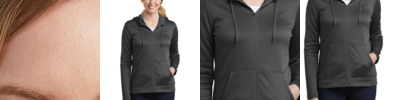 100% polyester heathered wicking knit top body, collar and sleeves ; 100% polyester wicking knit solid bottom body ; Ladies' fit ; Pad print label ; Quarter-zip pullover style; Self-fabric collar ; Set-in sleeves ;
