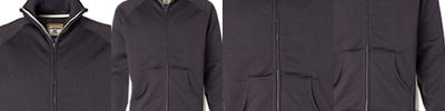 8 oz., stretch & sueded triblend terry; 51% rayon, 43% polyester, 6% elastine; 4-way stretch fabric withstriped loop back yarns; Set-in sleeves; Self fabric collar, waist & cuffs; Side gusset & hand pockets;