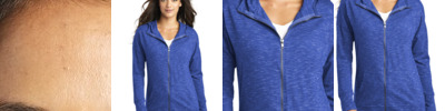 8 oz., stretch & sueded triblend terry; 51% rayon, 43% polyester, 6% elastine; 4-way stretch fabric with striped loop back yarns; Set-in sleeves & hand pockets; Self fabric collar, waist & cuffs;